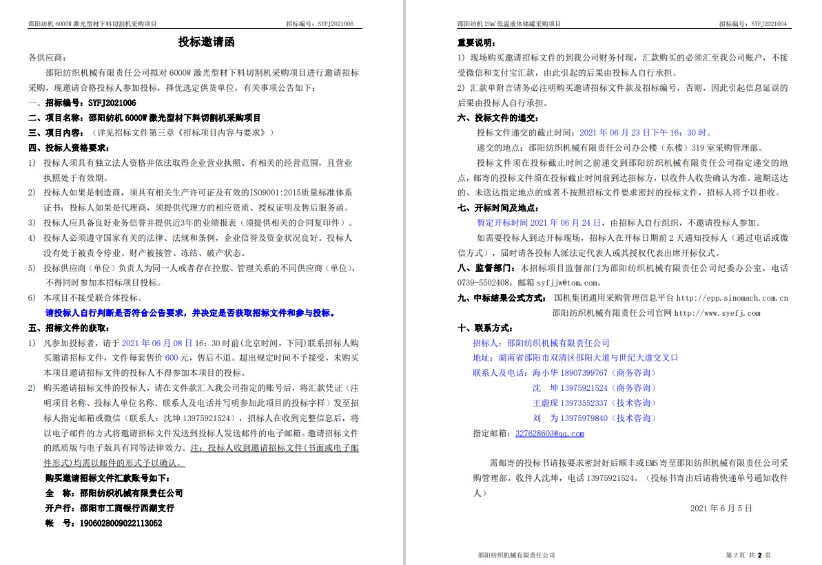邵陽紡機6000W激光型材下料切割機采購投標邀請函