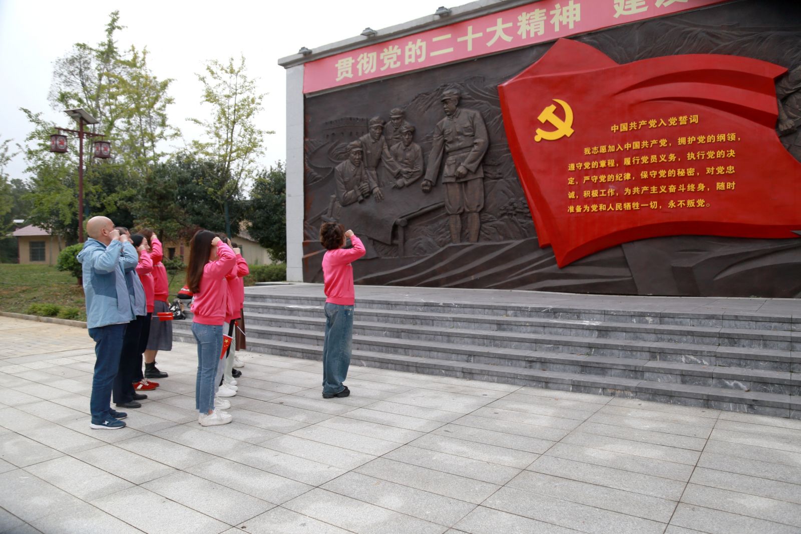 在永連村紅六軍團革命先輩的浮雕前,在鮮紅的黨旗下,全體黨員整齊列隊,高舉右手,重溫入黨誓詞。