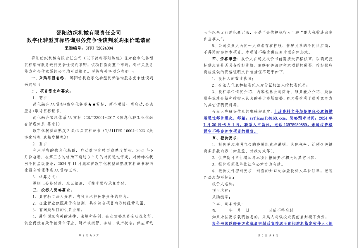 邵陽(yáng)紡機(jī)數(shù)字化轉(zhuǎn)型貫標(biāo)咨詢服務(wù)項(xiàng)目競(jìng)爭(zhēng)性談判報(bào)價(jià)邀請(qǐng)