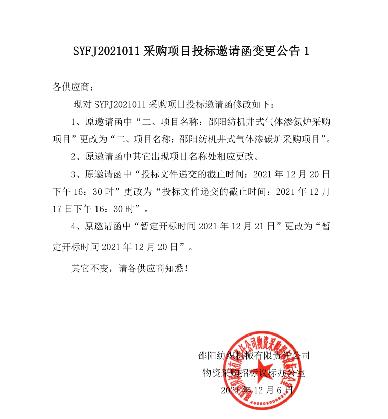 項目”更改為“二、項目名稱:邵陽紡機井式氣體滲碳爐采購......