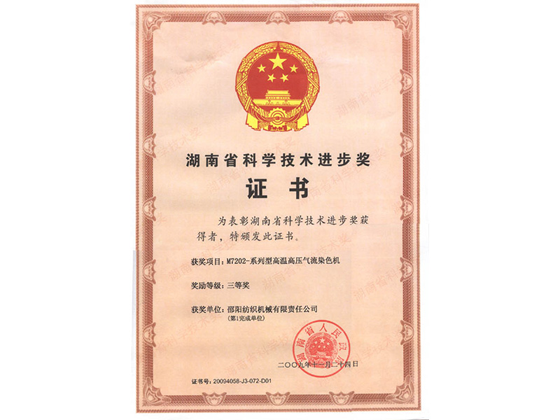 Third Prize of Hunan Province for High Temperature and High Pressure Package Dyeing Machine